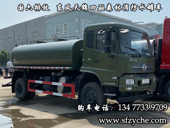 東風(fēng)天錦四驅(qū)森林消防灑水車_國六排放潤知星牌SCS5164GPSDFV6型四驅(qū)越野綠化噴灑車采用DFV2163GP6DJ型國六排放東風(fēng)天錦四驅(qū)越野底盤,東風(fēng)天錦D530一排半駕駛室,4×4驅(qū)動,康明斯B6.2NS6B210國六發(fā)動機(jī)210馬力,最大扭矩850N.m/1100-1700rpm,排量6.2L、韶齒手動六檔變速箱,東風(fēng)德納車橋,前驅(qū)動橋4.5噸,后橋10噸,10.00R20輪胎,軸距4500mm/4700mm,電動玻璃,方向助力,斷氣剎,ABS,大燈自動調(diào)節(jié),自動調(diào)整臂,選裝原廠空調(diào)。罐體采用優(yōu)質(zhì)碳鋼Q235板材,板材厚度4mm,罐體容積8.7立方,安裝夾心取力器,后置泵箱,消防栓接口左右各一個(gè),消防炮采用PS30-50D消防水炮,流量40L/S/1.0MPa 水射程:≥50m,消防泵采用常壓消防泵型號:CB10/40車用消防泵,流量:40L/s,壓力:1.0MPa,駕駛室頂部安裝長條警燈帶喊話器,兩側(cè)噴涂白色森林消防字樣。