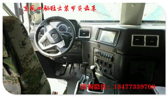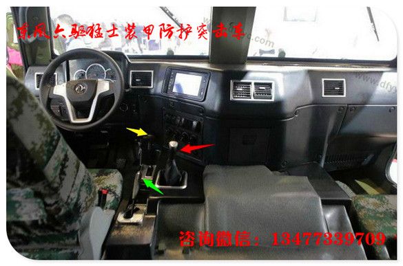 上圖是6輪驅(qū)動長軸2代猛士裝甲車駕駛艙特寫。較1代猛士裝甲車有24處改進。諸如:粗握把3幅面方向盤可以減緩駕駛員操作時的疲勞程度(1代猛士的方向盤為細握把,駕駛時間超過2小時手掌酸痛)。全新的組合儀表,將發(fā)動機轉(zhuǎn)速、車速、發(fā)動機水溫、機油壓力、蓄電池電壓顯示的更加清晰。各個功能按鍵全部改為由上至下按壓式大尺寸開關(guān)。而輪胎壓力調(diào)節(jié)開關(guān)從儀表臺左下側(cè)轉(zhuǎn)移至右側(cè)(此處改進有助于駕駛員快速操控)。