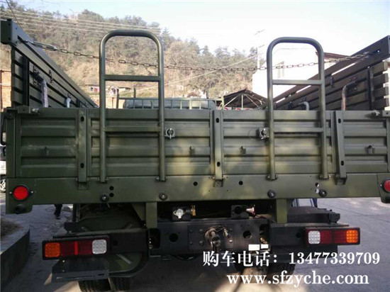 東風(fēng)國五天錦EQ1120GA2型運兵車,4×2驅(qū)動,D530平頭一排半平頂駕駛室,,軸距3800mm,康明斯ISD245 50國五排放245馬力,6.7升發(fā)動機,八擋變速箱,帶電加熱(預(yù)熱塞)冷起動裝置,全鋼全鋼 主油箱160L,80L副油箱,Φ395mm推式膜片彈簧離合器,東風(fēng) 4.5噸前橋,9噸后橋,主減速比5.286,車架斷面250×80×(7+4)mm,鋼板彈簧片數(shù)7/9+6,9.00R20鋼絲胎,電動玻璃升降器,中控門鎖,通道式儀表板,帶空調(diào),車廂內(nèi)部尺寸為4950x22325x600mm鐵木混合結(jié)構(gòu),邊板帶坐凳,板材采用國標(biāo)鋼材,邊板1.2mm,底板為3mm的花紋鋼板,車廂底橫梁用槽鋼加固,車廂縱副梁全槽鋼結(jié)構(gòu),能滿足客戶運輸重型貨物,適應(yīng)部隊野外使用及冰雪路面行駛要求。全面繼承東風(fēng)40多年軍車越野車制造經(jīng)驗,動力總成匹配合理,生產(chǎn)技術(shù)成熟穩(wěn)定,整車車輛全面通過軍檢。