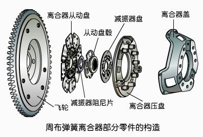 周布彈簧離合器的構(gòu)造特點(diǎn)是螺旋彈簧沿圓周均勻分布。周布彈簧式離合器的主、從動(dòng)部分、壓緊部分均安裝在離合器殼內(nèi)、外及駕駛室中。