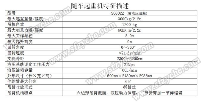 凈功率206kw; 起重機(jī)型號(hào)為:SQ302Z(帶液壓油箱),起重機(jī)質(zhì)量為:1200kg,最大額定超升載荷為:3000kg. 側(cè)防護(hù)金屬材料Q235斷面槽形,螺栓連接,斷面高度40mm,離地高度450mm; 后防護(hù)金屬材料Q235斷面槽形,螺栓連接,斷面高度135mm,離地高度500mm; 安裝具有衛(wèi)星定位功能行駛記錄儀,東風(fēng)越野隨車吊:m.cq664.com 吊機(jī)詳細(xì)參數(shù):