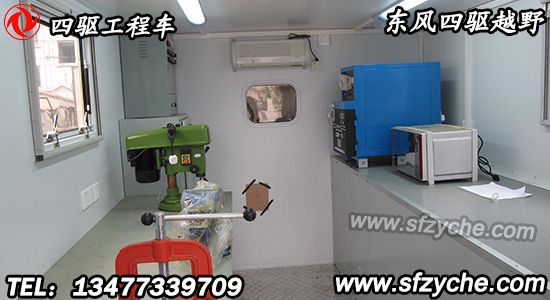 廂體頂部封閉,不可開啟?膳溲b功率相當、其他型號的發(fā)電機組。駕駛室前方安裝電動絞盤、廂體前部安裝備胎和可升降照明裝置、廂體內部安裝有發(fā)電機組、電焊機、線纜盤、臺虎鉗、切割機、工作臺等維修工具。側防護、后防護與車輛均采用焊接連接,材料均為:Q235,后防護斷面尺寸(mm):100×60, 離地高度:500 mm.