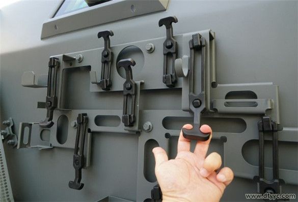 上圖是東風(fēng)四驅(qū)防雷反恐戰(zhàn)車右前側(cè)圍懸掛附加工具或補(bǔ)給品的懸掛特寫。用手較費(fèi)勁的抻拉橡膠懸掛鎖具。備用工具通過橡膠掛具與背板固定在車身側(cè)面,背板拆卸后可以成為盤等工具。