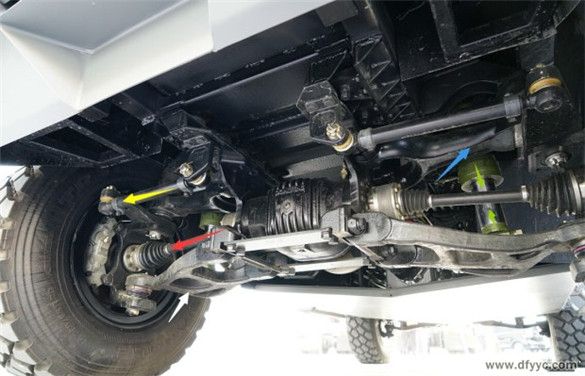 東風(fēng)四驅(qū)裝甲防雷反恐戰(zhàn)車為前置動力、實(shí)時四輪驅(qū)動設(shè)定,縱置發(fā)動機(jī)(白色箭頭)直接與變速器(綠色箭頭)剛性連接,通過中間傳動軸(黃色箭頭)至分動器,在經(jīng)過前傳動軸(紅色箭頭)與后傳動軸將動力輸出至前后驅(qū)動橋。